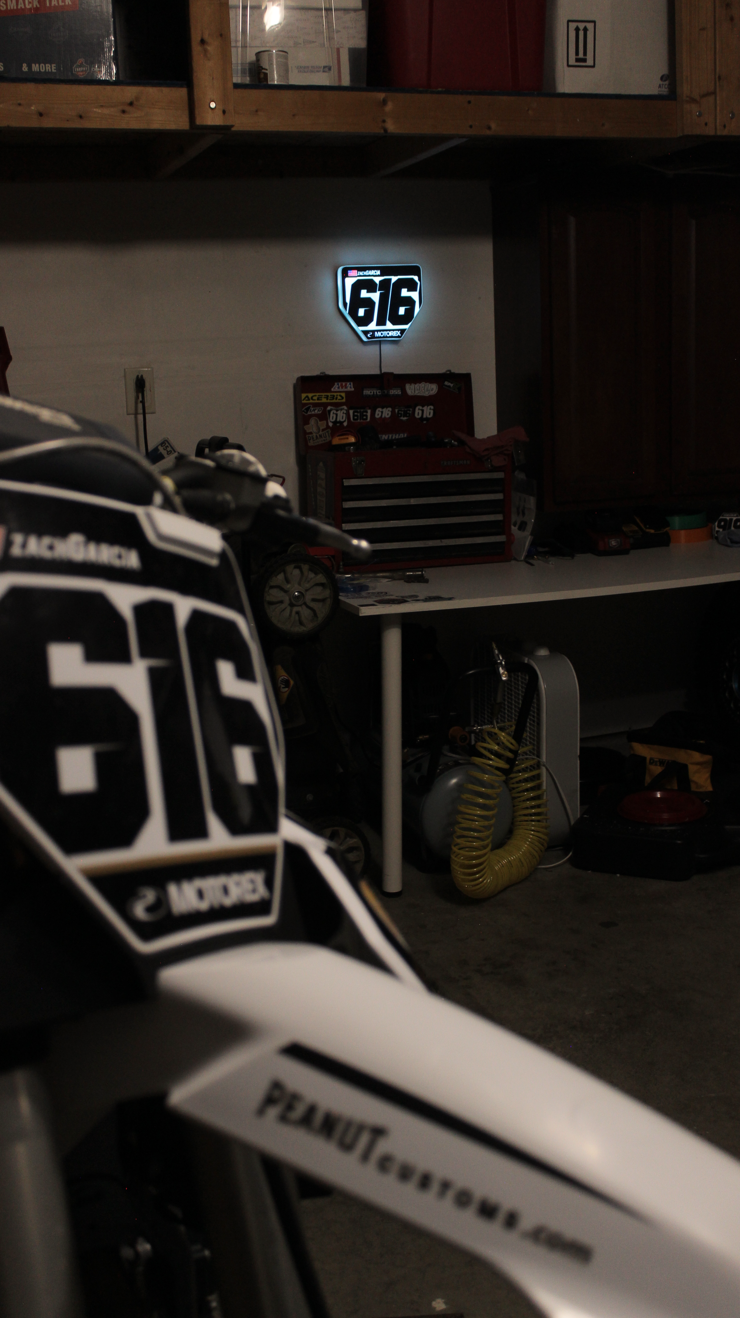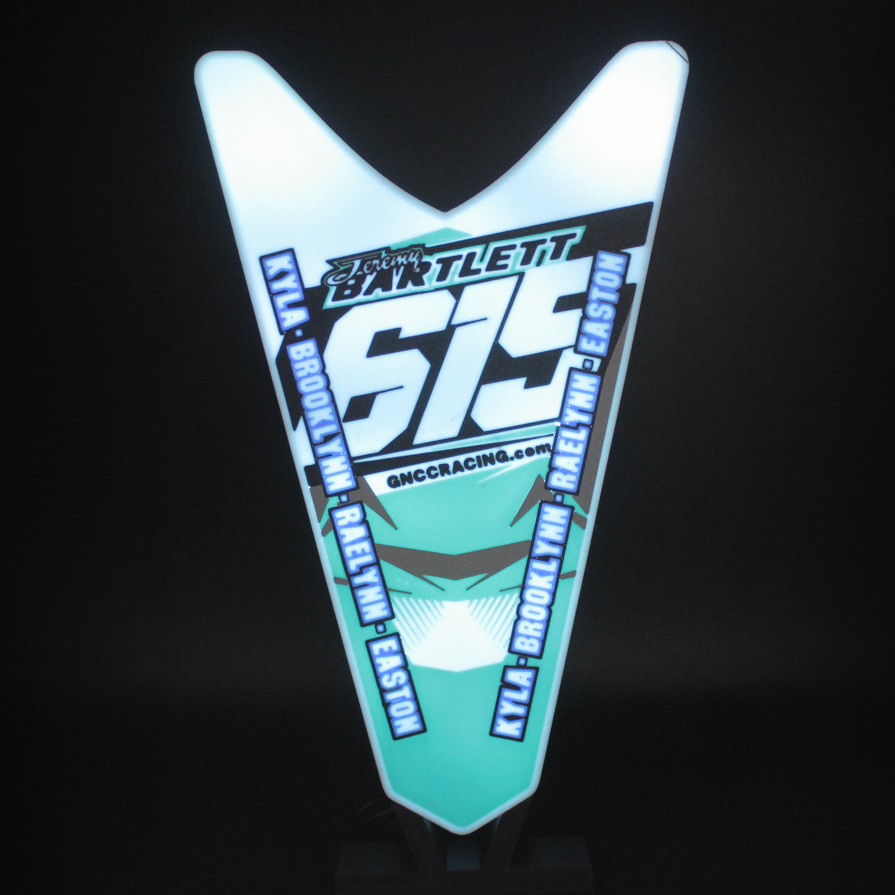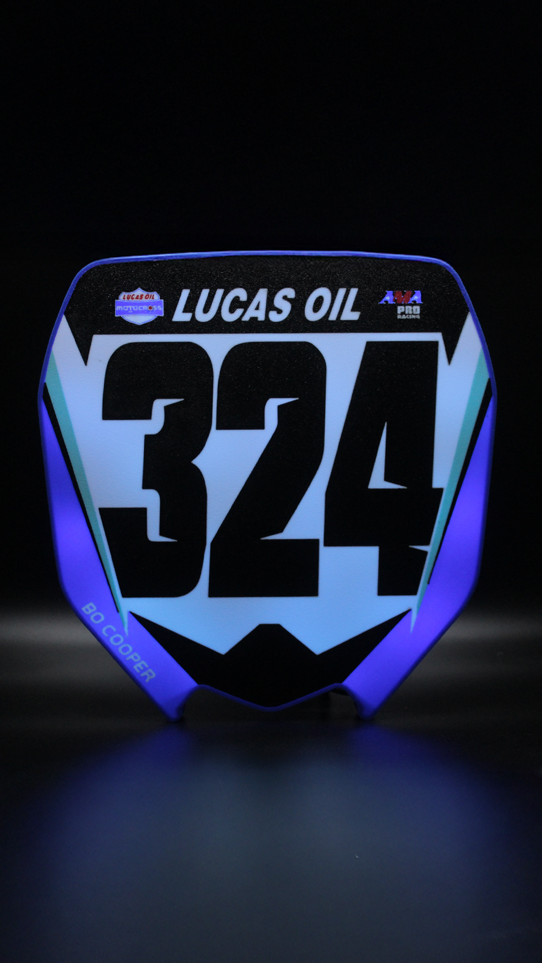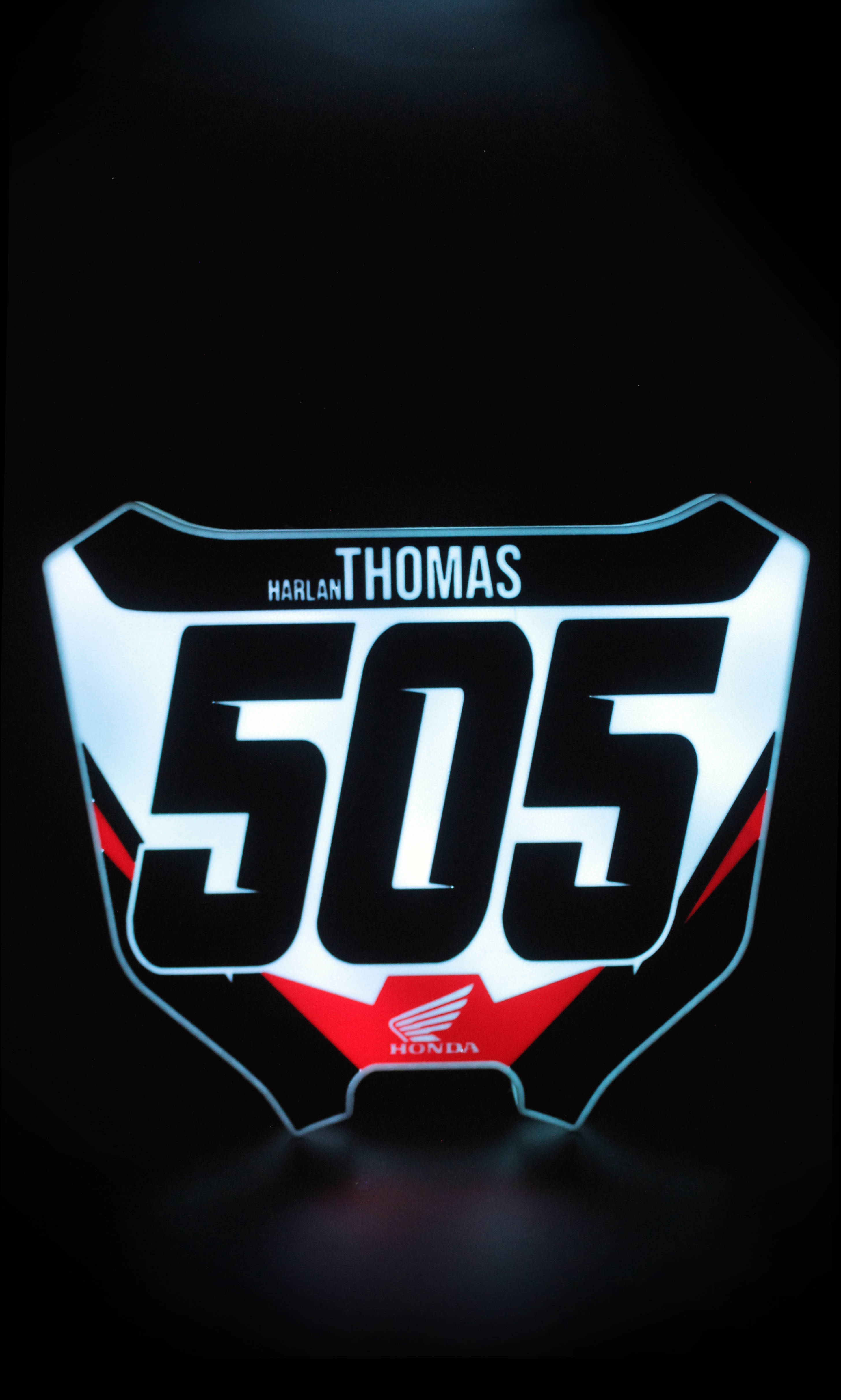 Designed to replicate the look of your front number plate, this USB-powered light box is perfect for motocross, ATV, and BMX enthusiasts. With personalized design, control the color changing modes with a remote or Bluetooth app while adding a unique glow to your garage, man cave, or workspace. Hang your custom light box on the wall or set it on your bench with the provided stand.