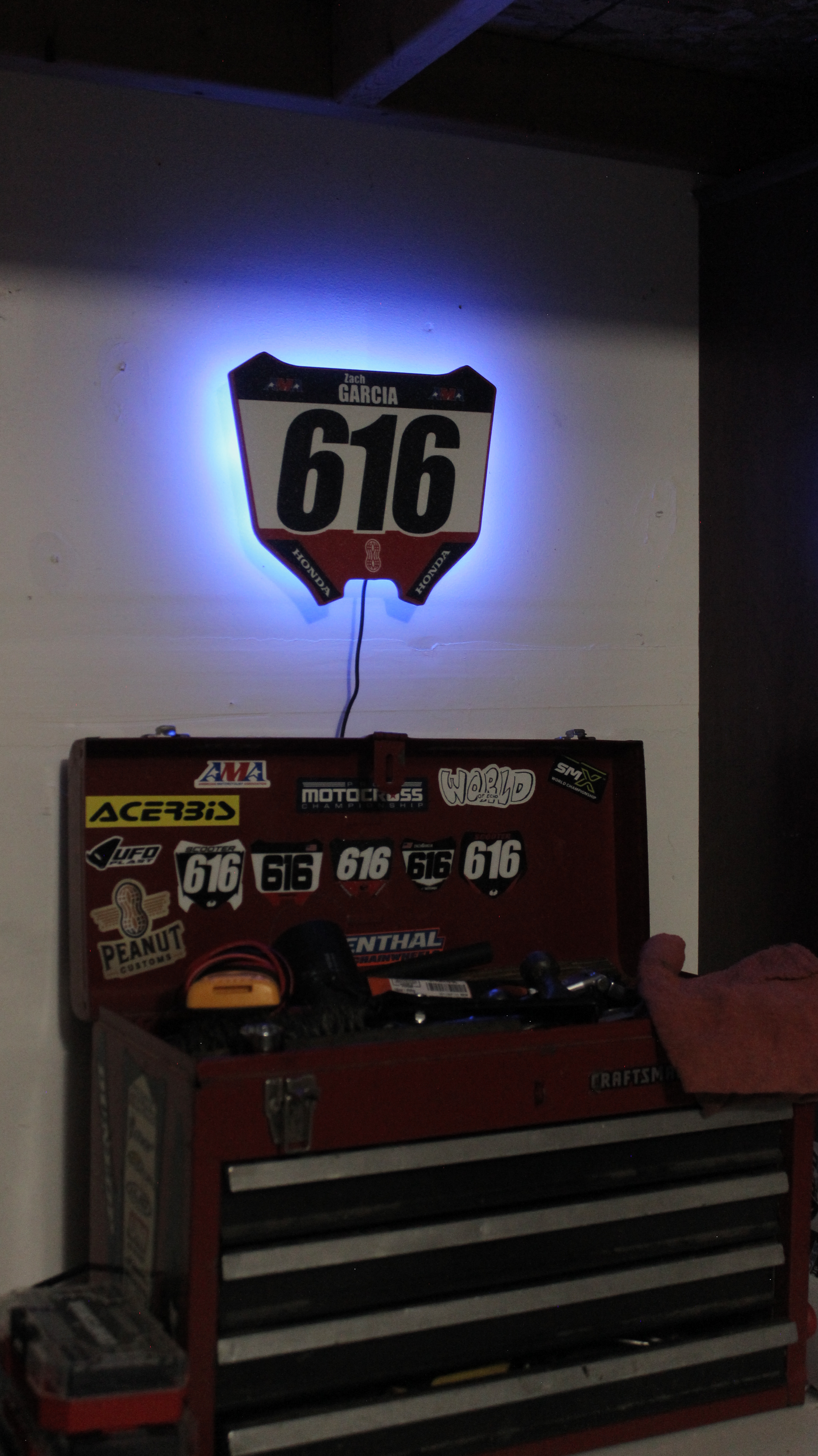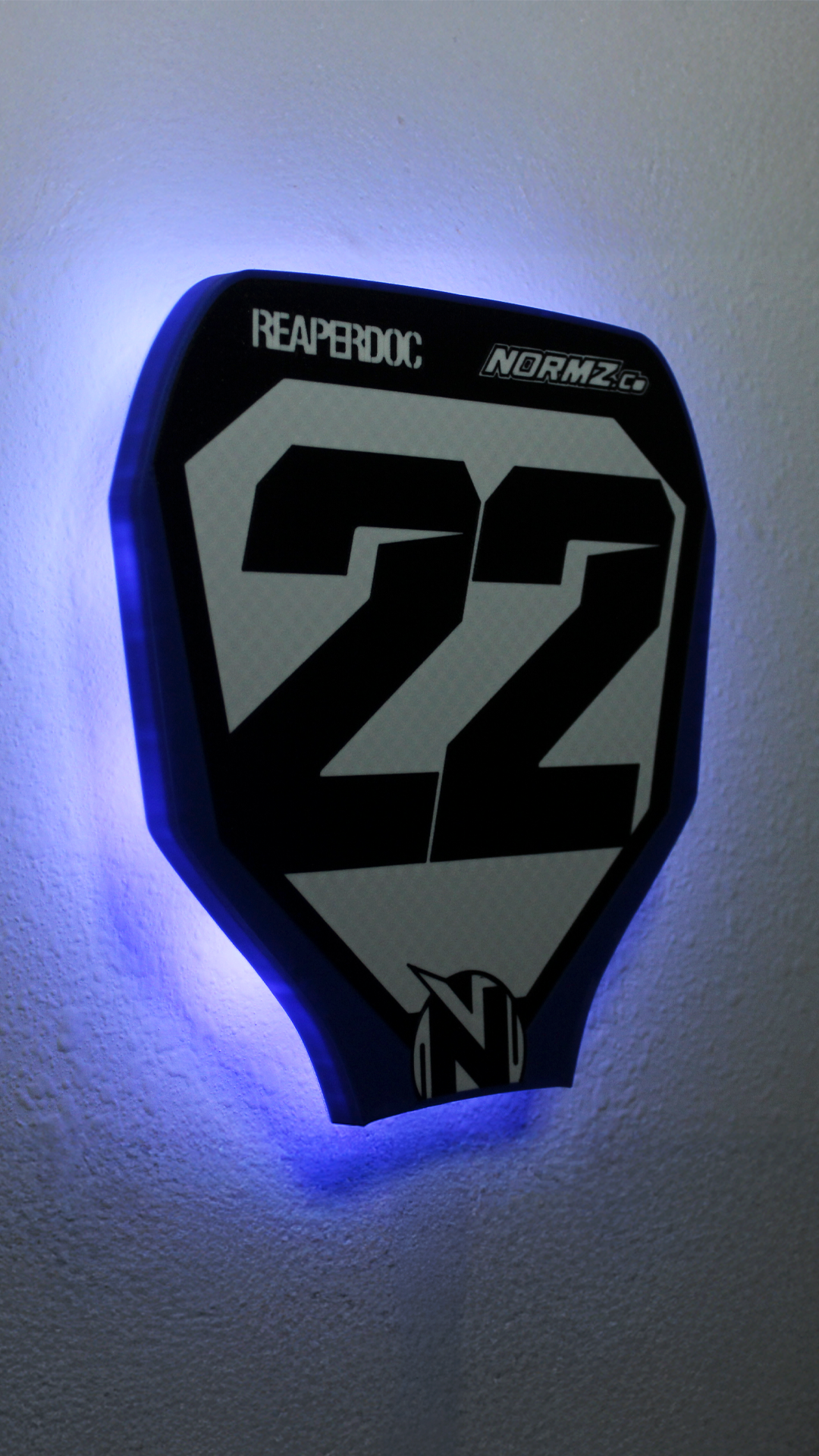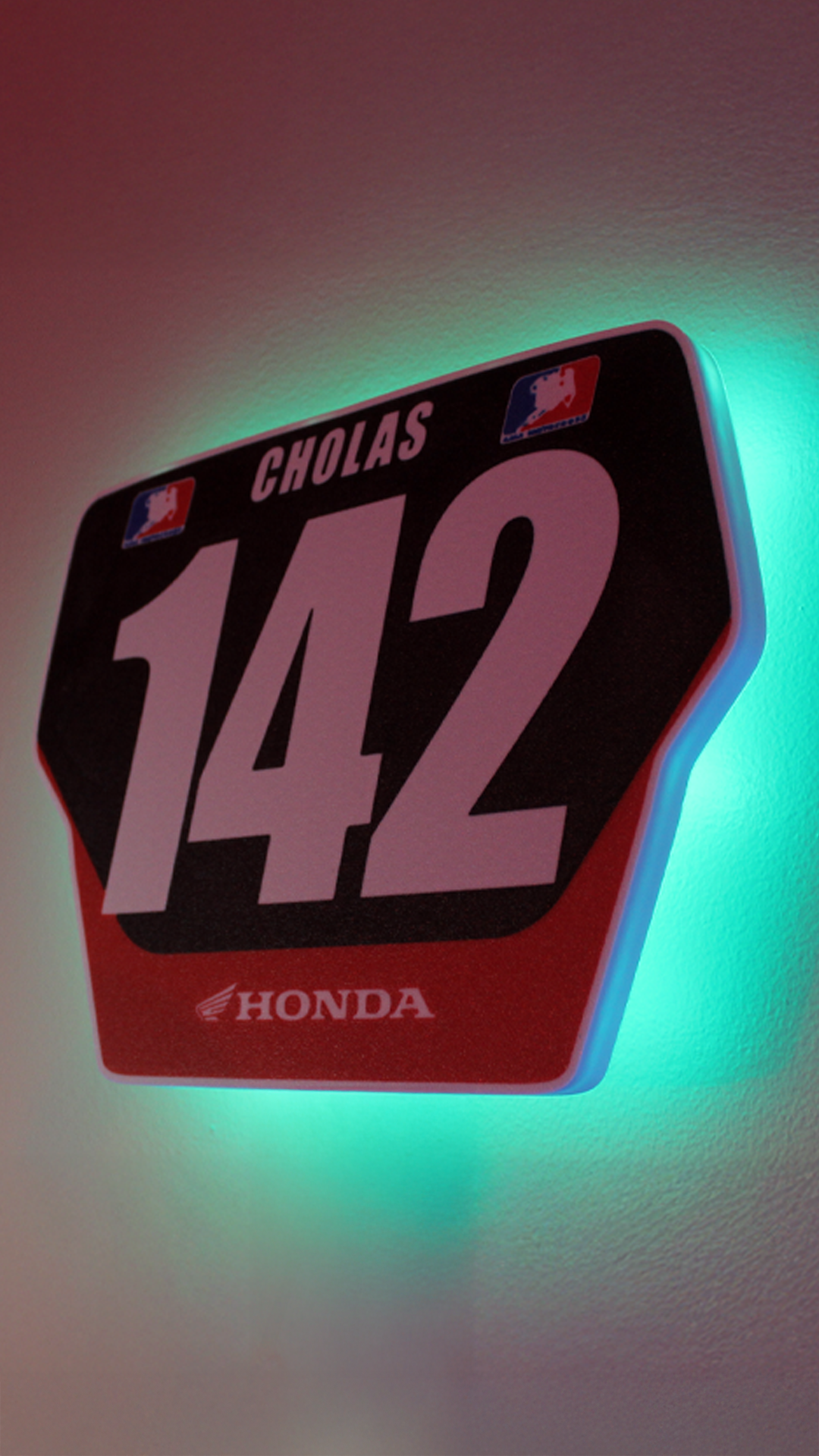 Designed to replicate the look of your front number plate, this USB-powered offset, backlit number plate is perfect for motocross, ATV, and BMX enthusiasts. With personalized design, control the color changing modes with a remote or Bluetooth app while adding a unique glow to your garage, man cave, or workspace.